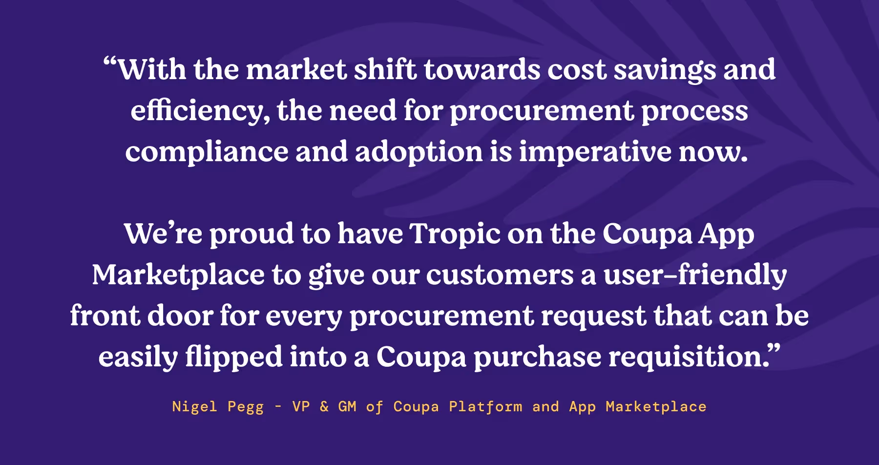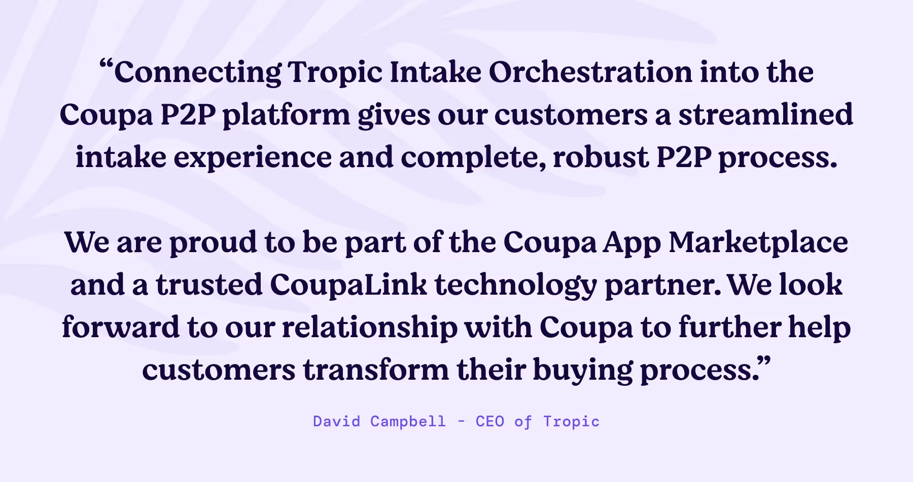 Tropic Intake Orchestration is now available in the Coupa App Marketplace! With its release, Tropic and Coupa now work together to run your intake-to-pay process all in one place.