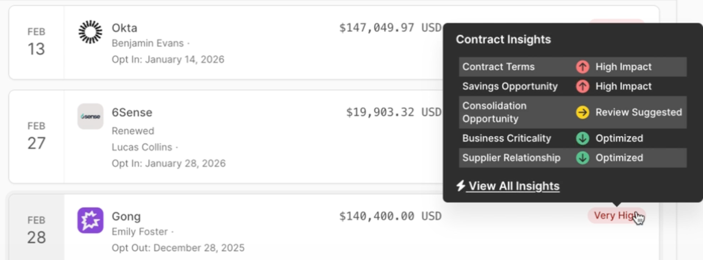 For the high-priority renewals, I can immediately pull up rich insights across categories like contract term, savings opportunity, consolidation opportunity, and more.