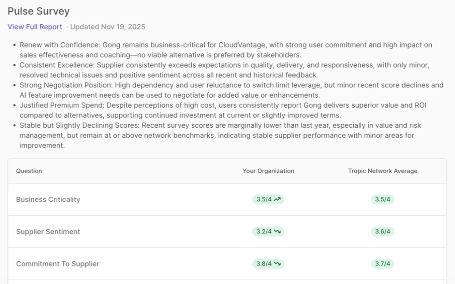 The Pulse Survey in Tropic is specifically designed to interrupt this pattern. I use it to quickly capture feedback from my team on upcoming renewals across multiple dimensions and compare our scores against the Tropic network average. And the part that actually changes the conversation is that it tells me whether a low score is: