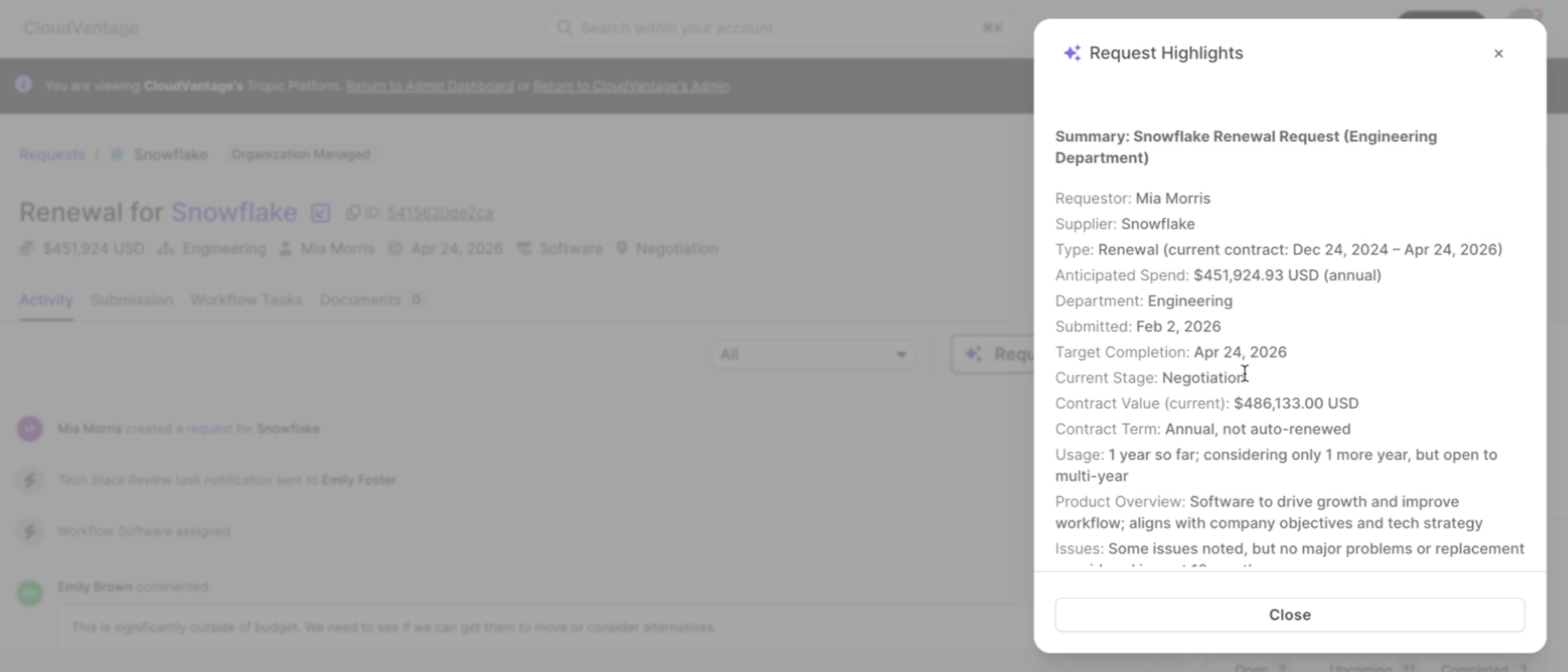 When I click into a purchase request, instead of reading through the full history, I hit Request Highlights. I’m given a flash briefing of sorts in one view under two minutes - the business justification, the negotiation process, the pricing comparison, and the compliance status.