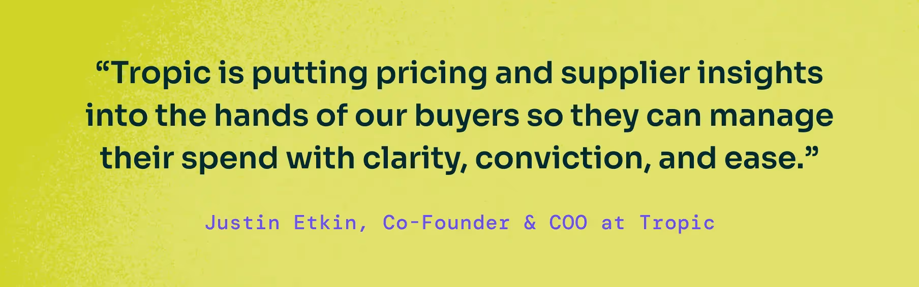 This is where Intelligent Spend Management comes in. Tropic is expanding upon our services foundation to take ownership around the challenges buyers face, such as lack of pricing transparency and operational inefficiency. We couldn’t be more excited to bring Intelligent Spend Management to the market and help buyers transition from understanding their spend to driving proactive action around greater efficiency.