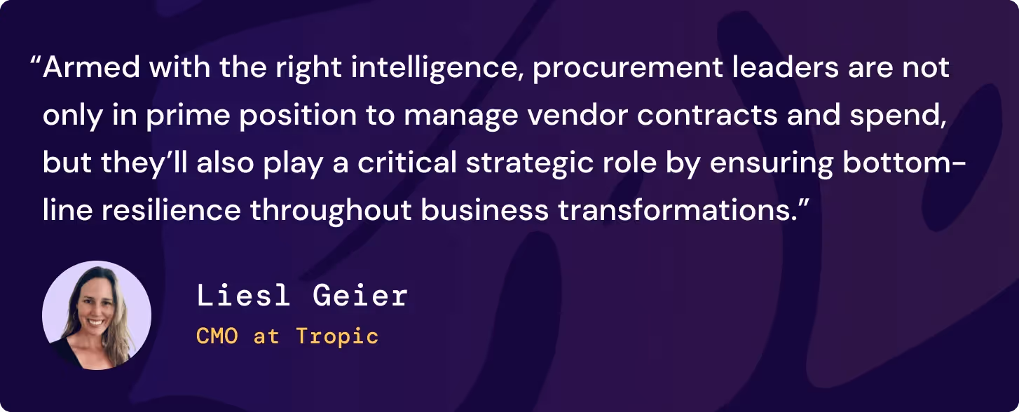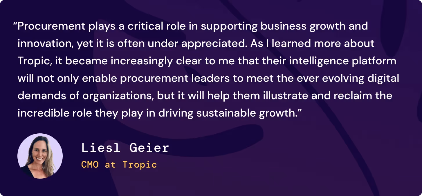 She is committed to making Tropic the center of this transformation and is fully invested in our mission: Make procurement teams the heroes of their organizations by empowering them with unprecedented visibility, control, and leverage over their spend.