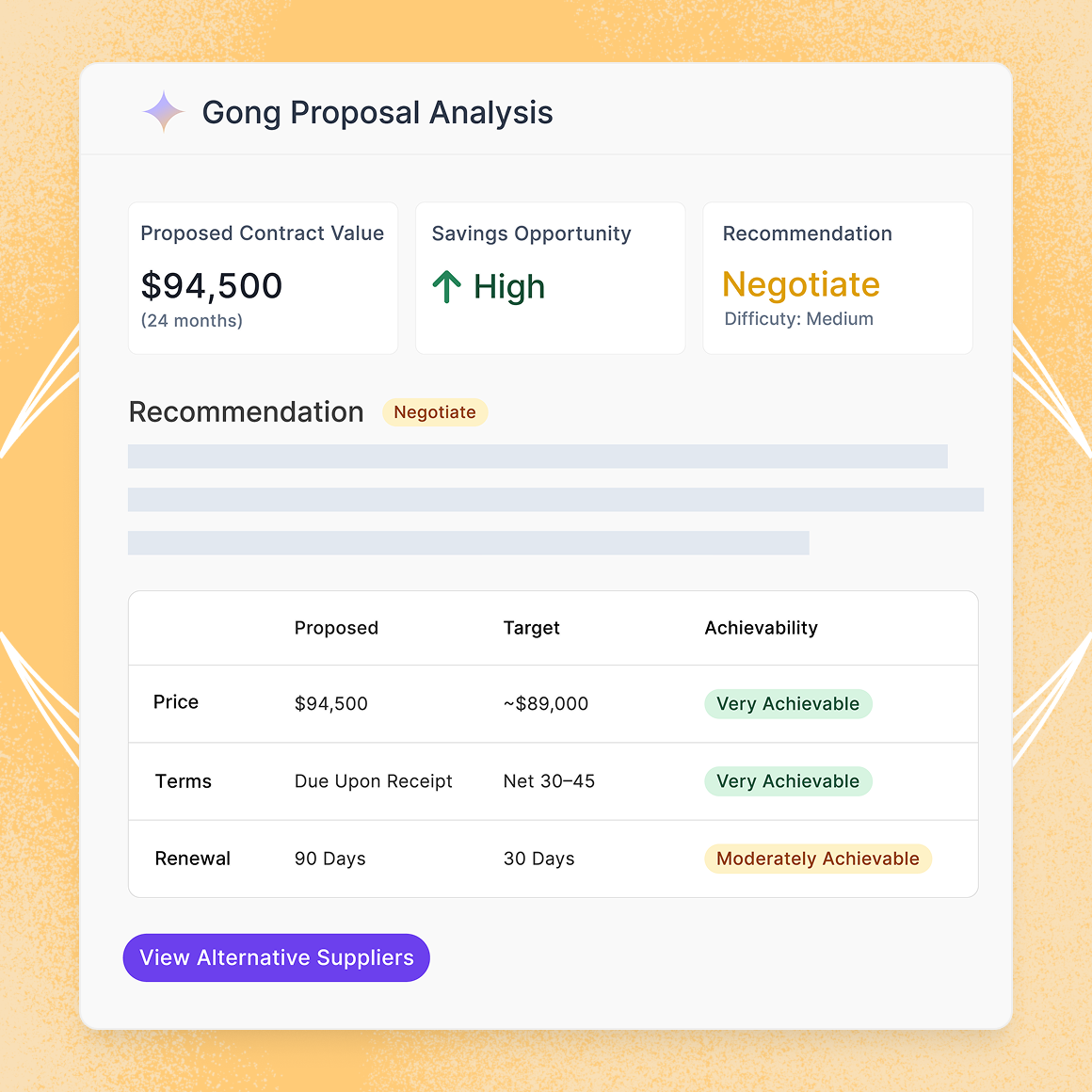 Renewals are planned. New proposals arrive on someone else's timeline, with a deadline attached. And in that moment — when you're holding a vendor quote and need to know if it's a fair deal — there's no time to dig through the platform, pull benchmarks manually, or wait for a procurement resource to free up.