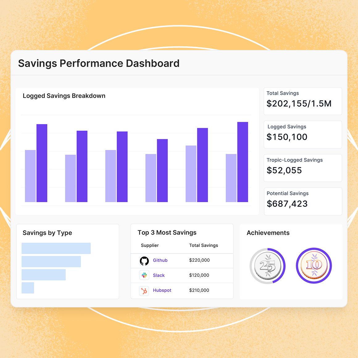 - Savings Badges: Because recognition matters. Milestone badges like "Six-Figure Saver" and "Million Dollar Club" can be shared on LinkedIn, giving individuals and teams a way to celebrate and communicate their impact