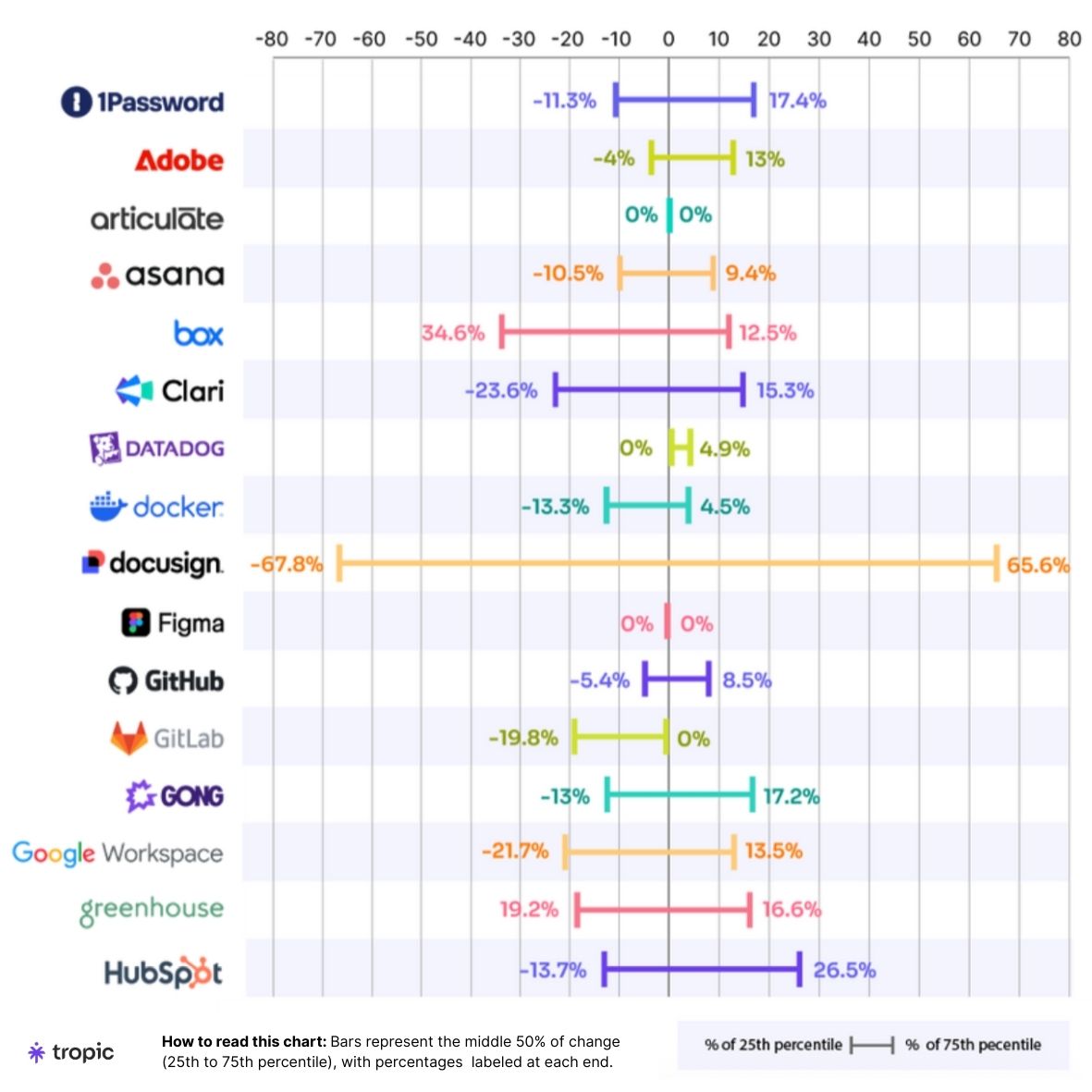 - Okta presents a 42-point spread (-28% to +14%), making it one of the higher-priority security tool renewals. Given Okta's central role in identity management, even small percentage gains compound across large user bases. This is where volume leverage and competitive alternatives (Auth0, Microsoft Entra) create real negotiating room.