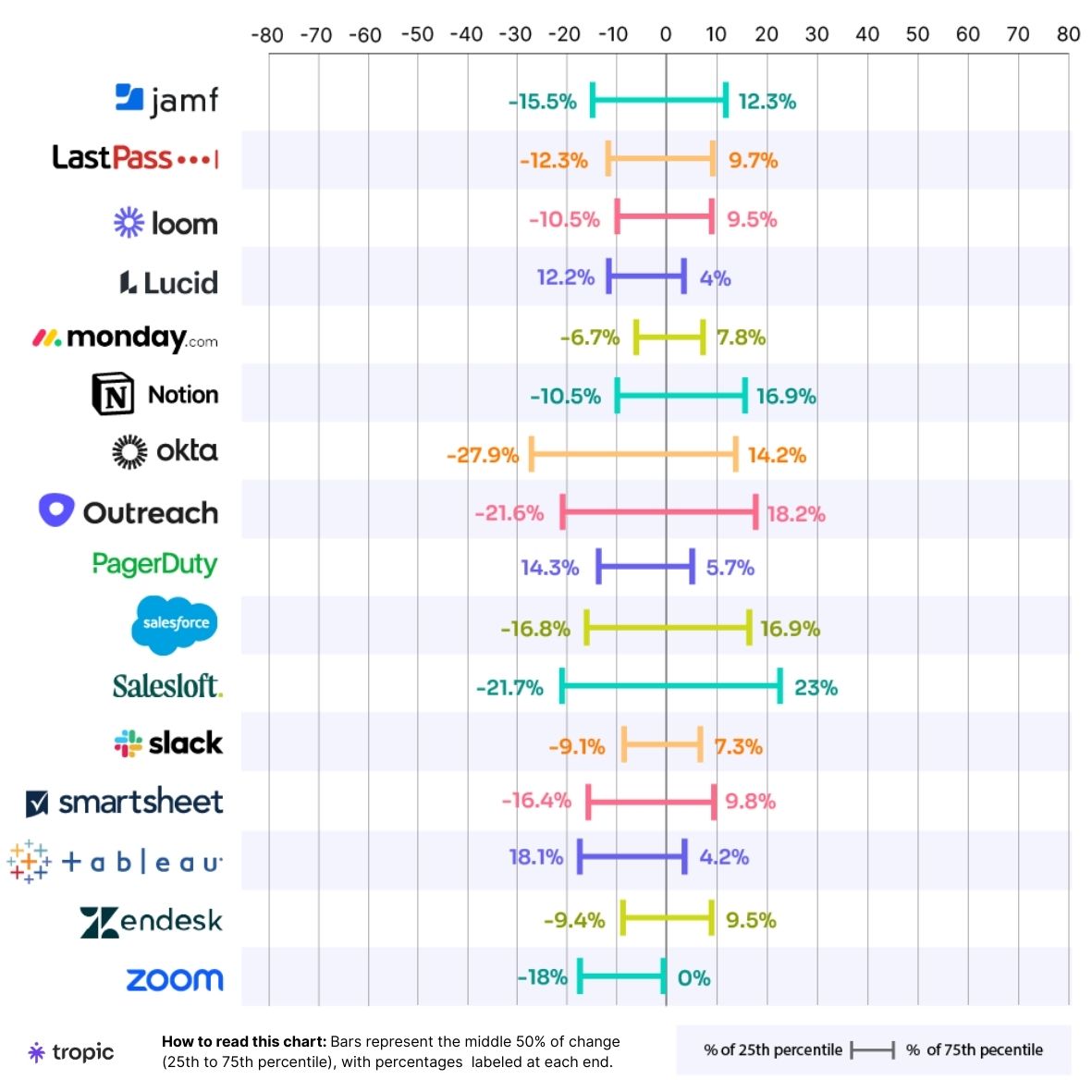 - Okta: -28% to +14% (42-point spread)
