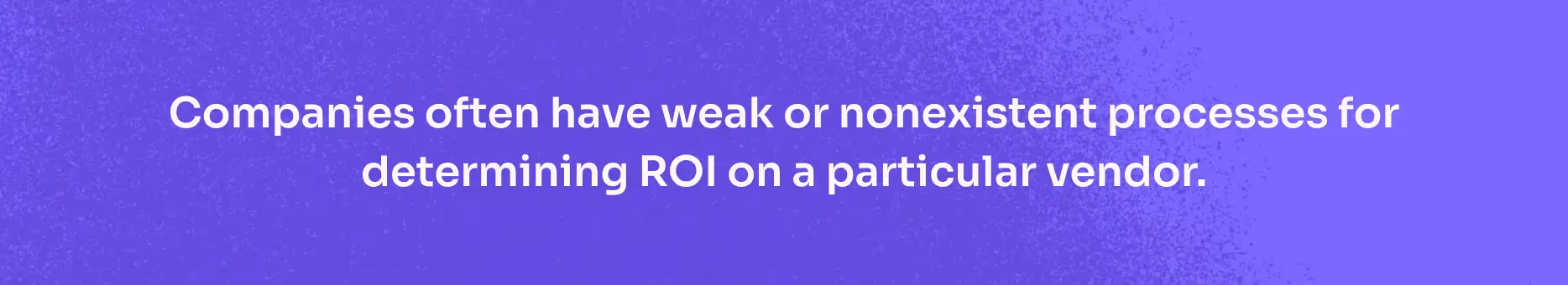Also known as “not getting what you paid for.” Companies often have weak or nonexistent processes for determining ROI on a particular vendor. Failing to continuously monitor and manage vendor performance against the agreed contract terms can lead to subpar service delivery, unexpected costs, and disputes.