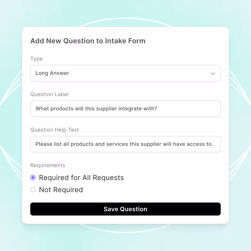 Add a questionnaire as a step in your workflow to collect information from teammates or suppliers. Questionnaires can be customized to ask whatever you require and to upload key documents.