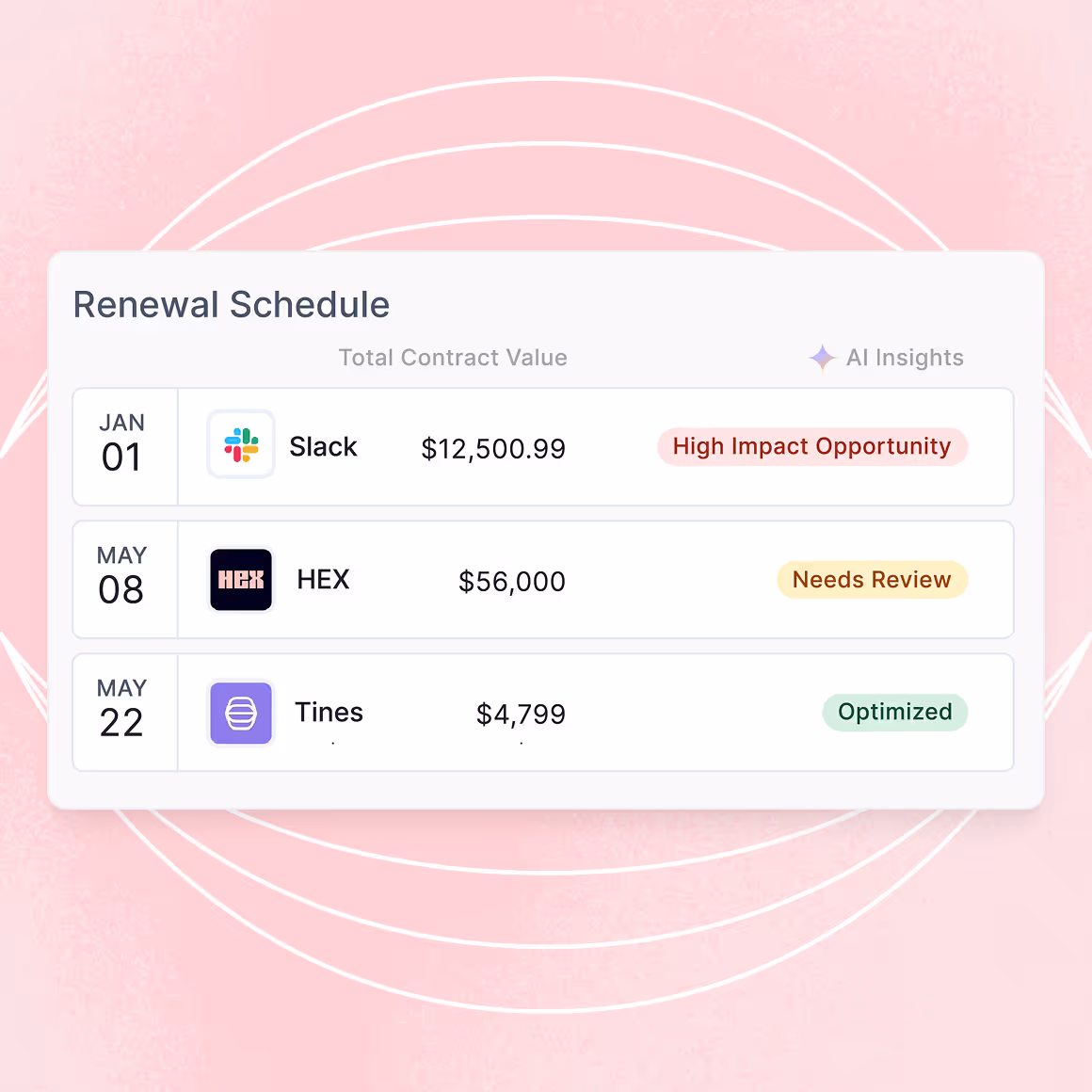 Get automatically notified via email or Slack with AI-powered insights, not just dates. Know immediately whether each renewal needs your attention or can be fast-tracked.