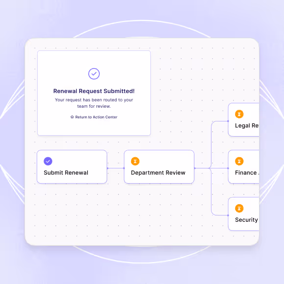 Start renewal requests directly from notifications or calendar with all the AI information pre-loaded. Renewals route through established workflows with full context for stakeholder review